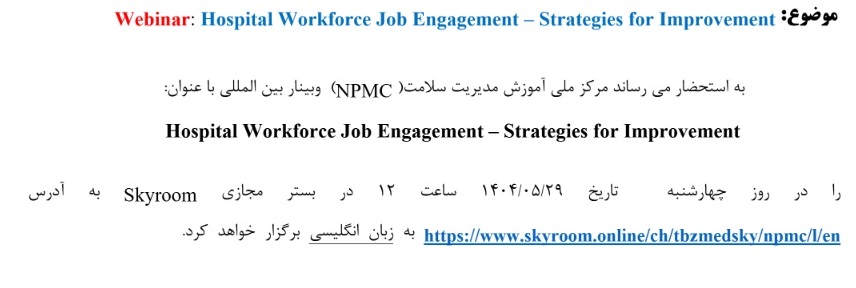 وبینار آموزشی بین المللی Hospital Workforce Job Engagement – Strategies for Improvement ۲۹ مرداد ۱۴۰۴ | ۱۰:۰۱ کد : ۵۳۹۲۵ اطلاعیه ارسال به دیگران نام شما ایمیل شما ایمیل دریافتکننده ارسال انصراف تعداد بازدید:۱۴۱۲ وبینار آموزشی بین المللی Hospital Workforce Job Engagement – Strategies for Improvement