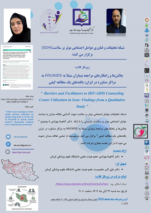 شبکه تحقیقات و فناوری عوامل اجتماعی موثر بر سلامت وزارت بهداشت و درمان، جهت آشنایی علاقه مندان به مباحث عوامل اجتماعی موثر بر سلامت، نشستی را با ارائه دکتر آناهیتا بهزادی با  موضوع " چالش ها و راهکارهای مراجعه بیماران مبتلا به HIV/AIDS به مراکز مشاوره در ایران، یافته های یک مطالعه کیفی"  را به صورت مجازی برگزار می کند .